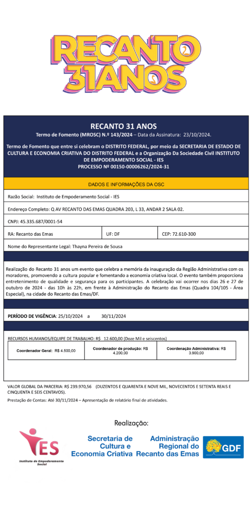 OBJETO: Promover o acesso gratuito à cultura, ao lazer e à formação artística no Recanto das Emas, por meio de apresentações culturais e atividades recreativas.