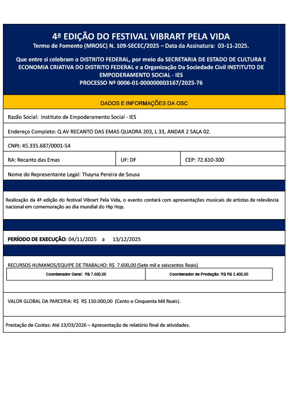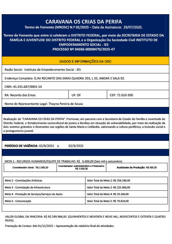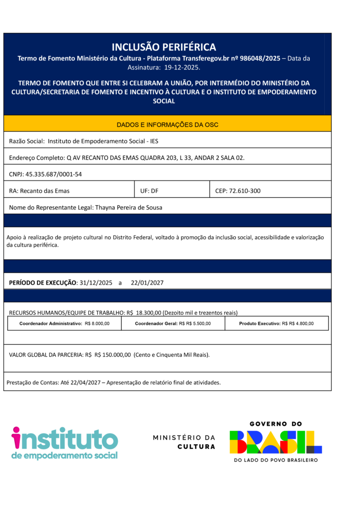 OBJETO:Apoio à realização de projeto cultural no Distrito Federal, voltado à promoção da inclusão social, acessibilidade e valorização da cultura periférica.