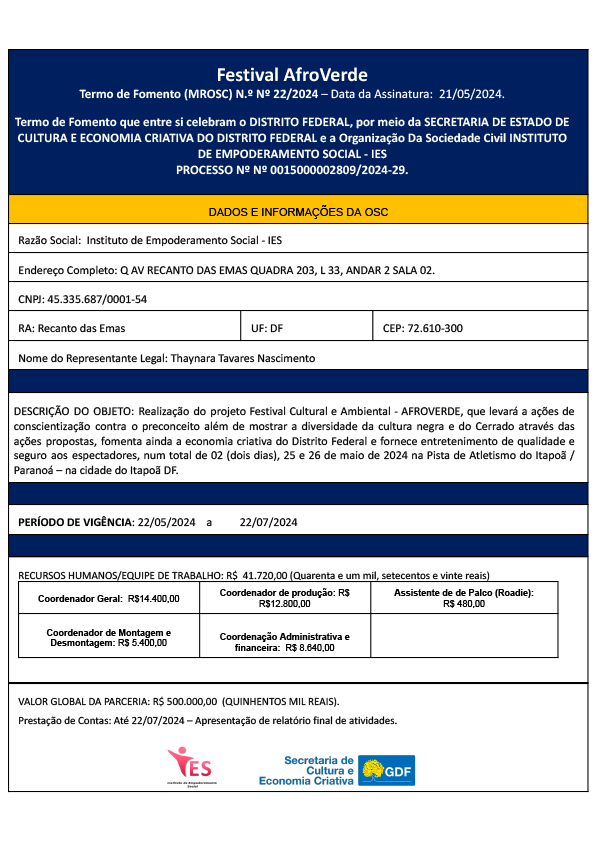 OBJETO: Realização do projeto Festival Cultural e Ambiental – AFROVERDE, que levará a ações de conscientização contra o preconceito além de mostrar a diversidade da cultura negra e do Cerrado através das ações propostas, fomenta ainda a economia criativa do Distrito Federal e fornece entretenimento de qualidade e seguro aos espectadores, num total de 02 (dois dias), 25 e 26 de maio de 2024 na Pista de Atletismo do Itapoã / Paranoá – na cidade do Itapoã DF.