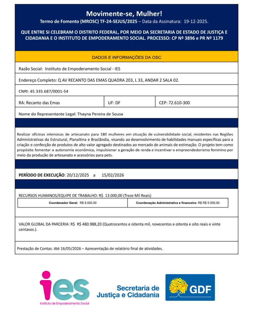 OBJETO: Realizar oficinas intensivas de artesanato para 180 mulheres em situação de vulnerabilidade social, residentes nas Regiões Administrativas da Estrutural, Planaltina e Brazlândia, visando ao desenvolvimento de habilidades manuais específicas para a criação e confecção de produtos de alto valor agregado destinados ao mercado de animais de estimação. O projeto tem como propósito fomentar a autonomia econômica, impulsionar a geração de renda e incentivar o empreendedorismo feminino por meio da produção de artesanato e acessórios para pets.