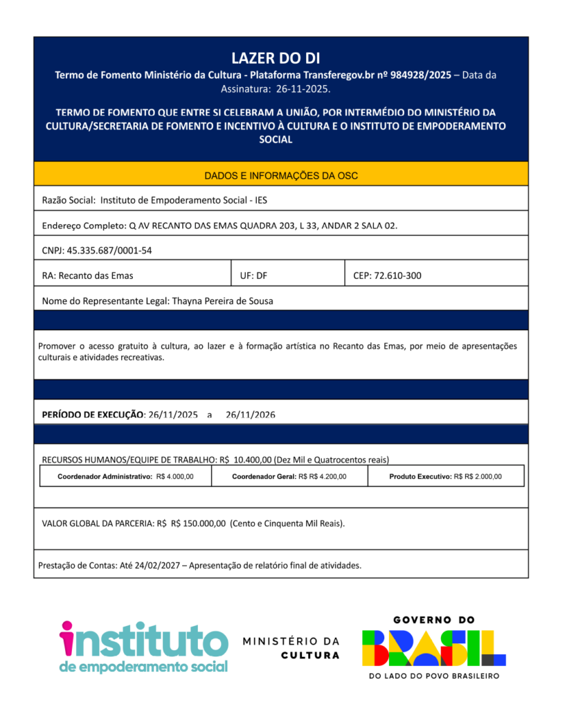 Termo de Fomento Ministério da Cultura – Plataforma Transferegov.br nº 984928/2025 TERMO DE FOMENTO QUE ENTRE SI CELEBRAM A UNIÃO, POR INTERMÉDIO DO MINISTÉRIO DA CULTURA/SECRETARIA DE FOMENTO E INCENTIVO À CULTURA E O INSTITUTO DE EMPODERAMENTO SOCIAL